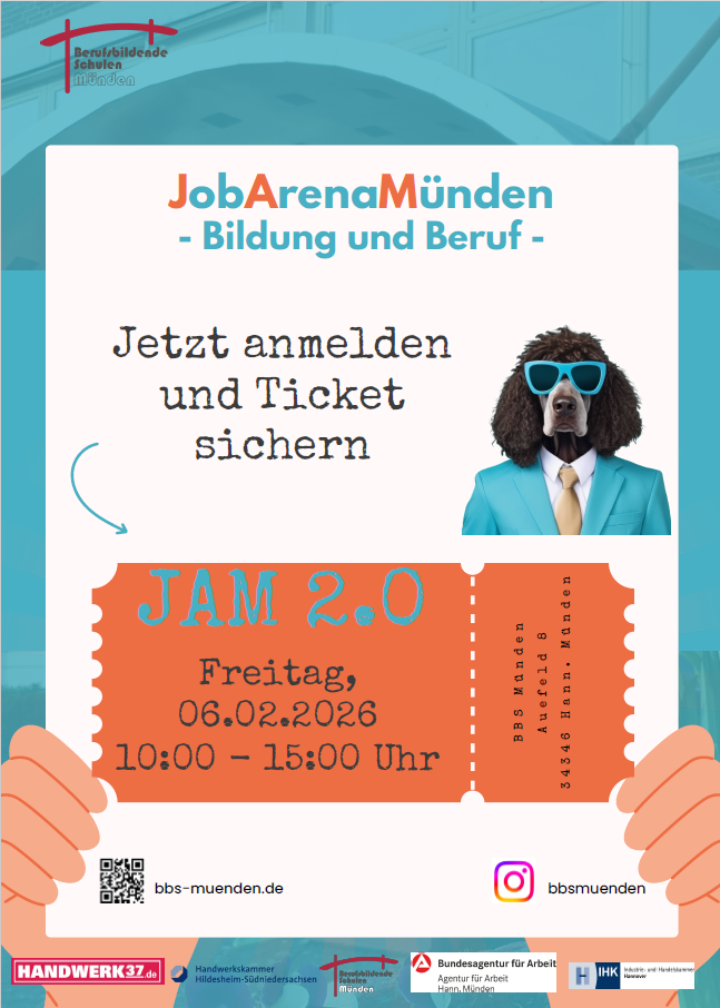 Das Datum der 2. JobArenaMünden ist Freitag, 06.02.2026, von 10 bis 15Uhr! Wir freuen uns auf Sie! Das waren die JAM – Aktionen Übersicht der Betriebe der 1.JAM Pressemitteilungen Der Arbeitsagentur