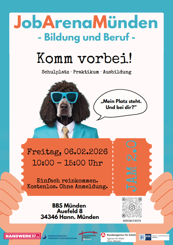 Du willst wissen, welcher Job wirklich zu dir passt? Dann komm am Freitag, 6. Februar 2026, von 10–15 Uhr zur JobArenaMünden 2.0 an den BBS Münden!